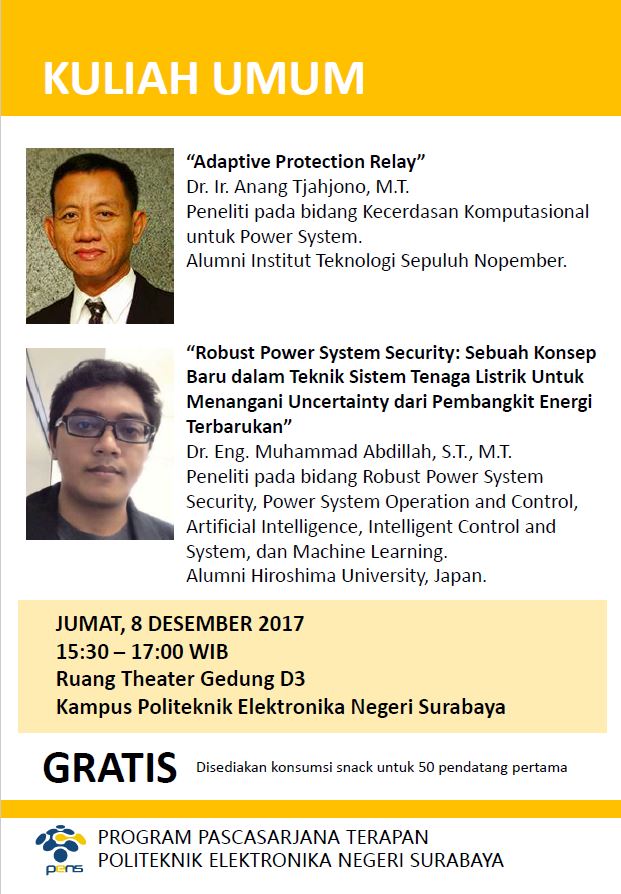 8 Desember 2017Pascasarjana PENS mengadakan kuliah umum dengan topik Adaptive Protection Relay dengan pembicara Dr. Ir. Anang Tjahjono, MT., dan Robust Power System Security : Sebuah Konsep Baru dalam Teknik Sistem Tenaga Listrik Untuk Menangani Uncertainty dari Pembangkit Energi Terbarukan dengan pembicara Dr. Eng. Muhammad Abdillah, S.T., M.T., pada Jumat 8 Desember 2017.